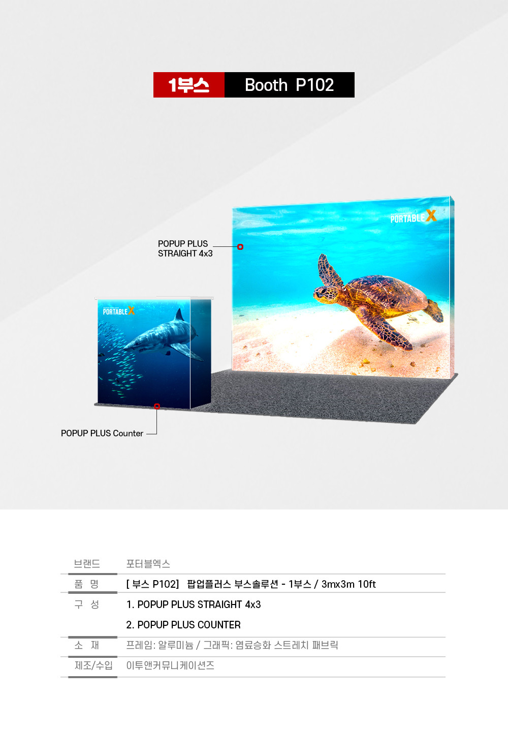 팝업플러스 프레임과 카운터를 조합해 구성한 부스솔루션입니다. --------------------------------- 포함 사항 POPUP PLUS STRAIGHT FRAME POPUP PLUS COUNTER CONNECTOR 단면+측면인쇄 (카운터는 양면인쇄) ----------------------------------- 불포함 사항 LED Spotlight, LED curtain, LED Bar 위 제품이 필요한 경우 별도 문의 바랍니다. ----------------------------------- 팝업 플러스 시스템은 전량 주문 제작 상품으로 주문으로부터 영업일 기준 약 20일의 제작기간이 소요됩니다.