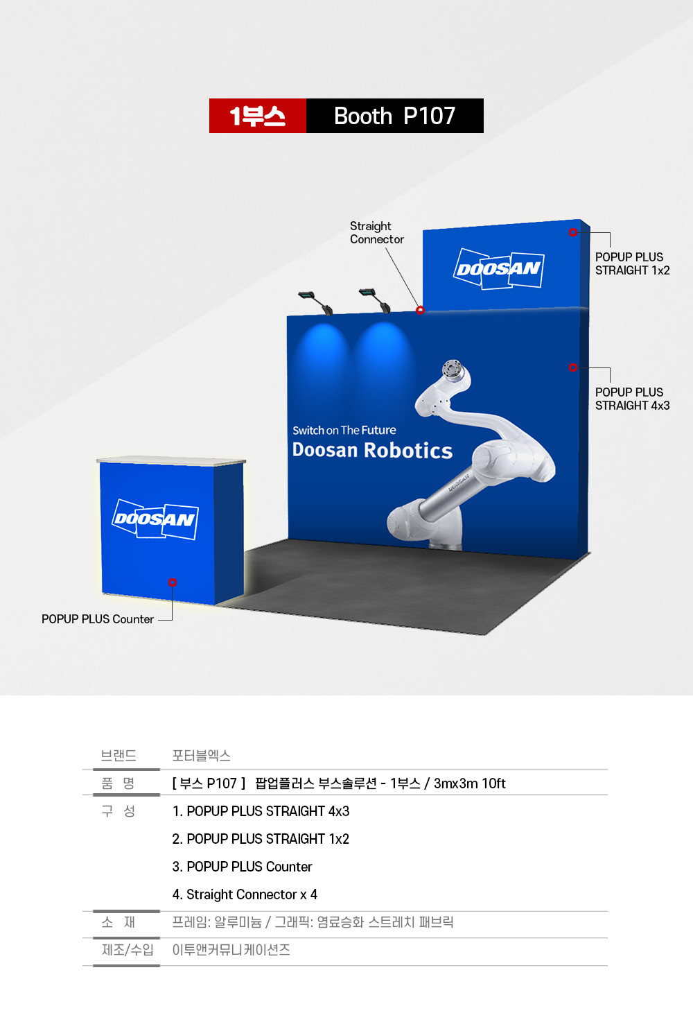 팝업플러스 프레임과 카운터를 조합해 구성한 부스솔루션입니다. --------------------------------- 포함 사항 POPUP PLUS STRAIGHT FRAME POPUP PLUS COUNTER CONNECTOR 단면+측면인쇄 (카운터는 양면인쇄) ----------------------------------- 불포함 사항 LED Spotlight, LED curtain, LED Bar 위 제품이 필요한 경우 별도 문의 바랍니다. ----------------------------------- 팝업 플러스 시스템은 전량 주문 제작 상품으로 주문으로부터 영업일 기준 약 20일의 제작기간이 소요됩니다.