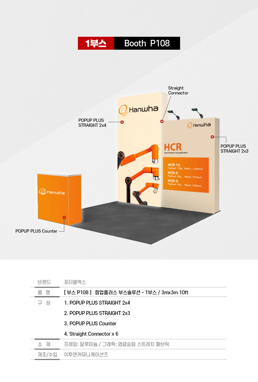 팝업플러스 프레임과 카운터를 조합해 구성한 부스솔루션입니다. --------------------------------- 포함 사항 POPUP PLUS STRAIGHT FRAME POPUP PLUS COUNTER CONNECTOR 단면+측면인쇄 (카운터는 양면인쇄) ----------------------------------- 불포함 사항 LED Spotlight, LED curtain, LED Bar 위 제품이 필요한 경우 별도 문의 바랍니다. ----------------------------------- 팝업 플러스 시스템은 전량 주문 제작 상품으로 주문으로부터 영업일 기준 약 20일의 제작기간이 소요됩니다.