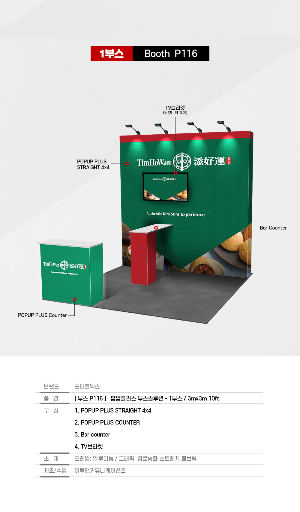 팝업플러스 프레임과 카운터를 조합해 구성한 부스솔루션입니다. --------------------------------- 포함 사항 POPUP PLUS STRAIGHT FRAME POPUP PLUS COUNTER CONNECTOR 단면+측면인쇄 (카운터는 양면인쇄) ----------------------------------- 불포함 사항 LED Spotlight, LED curtain, LED Bar 위 제품이 필요한 경우 별도 문의 바랍니다. ----------------------------------- 팝업 플러스 시스템은 전량 주문 제작 상품으로 주문으로부터 영업일 기준 약 20일의 제작기간이 소요됩니다.