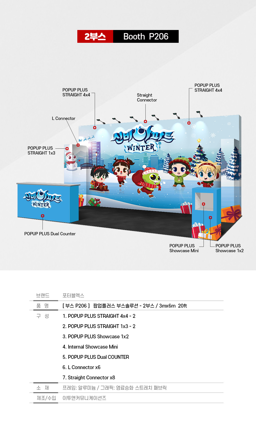 팝업플러스 프레임과 카운터를 조합해 구성한 부스솔루션입니다. --------------------------------- 포함 사항 POPUP PLUS STRAIGHT FRAME POPUP PLUS COUNTER INTERNAL SHOWCASE CONNECTOR 단면+측면인쇄 (카운터는 양면인쇄) ----------------------------------- 불포함 사항 LED Spotlight, LED curtain, LED Bar 위 제품이 필요한 경우 별도 문의 바랍니다. ----------------------------------- 팝업 플러스 시스템은 전량 주문 제작 상품으로 주문으로부터 영업일 기준 약 20일의 제작기간이 소요됩니다.