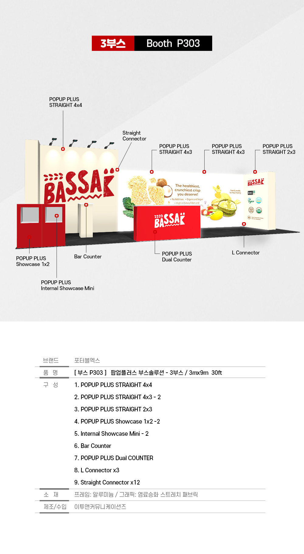 팝업플러스 프레임과 카운터를 조합해 구성한 부스솔루션입니다. --------------------------------- 포함 사항 POPUP PLUS STRAIGHT FRAME POPUP PLUS COUNTER INTERNAL SHOWCASE CONNECTOR 단면+측면인쇄 (카운터는 양면인쇄) ----------------------------------- 불포함 사항 LED Spotlight, LED curtain, LED Bar 위 제품이 필요한 경우 별도 문의 바랍니다. ----------------------------------- 팝업 플러스 시스템은 전량 주문 제작 상품으로 주문으로부터 영업일 기준 약 20일의 제작기간이 소요됩니다.