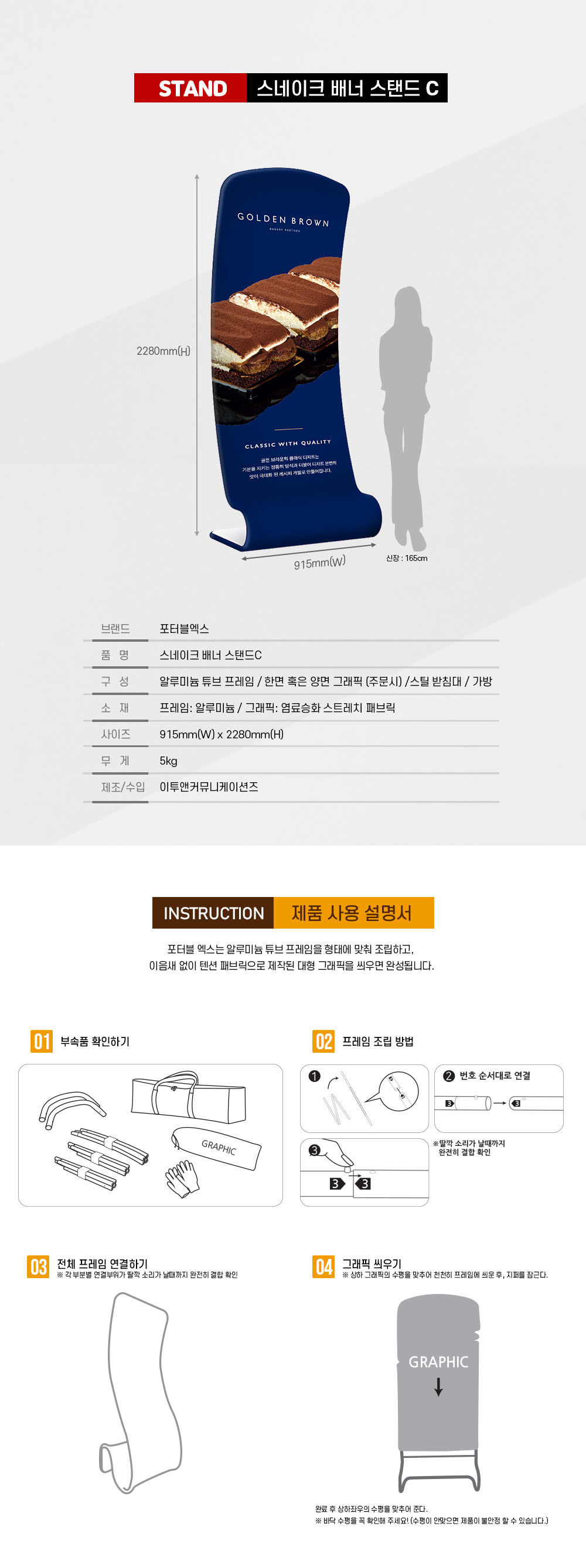 SNAKE STAND · 다용도 홍보 배너 스탠드 · 독창적이고 차별화된 디자인 · 무공구로 5분 만에 설치 가능 · 혼자서도 운반이 가능한 경량 프레임 · 열전사 방식 선명한 해상도의 그래픽 · 5가지 스타일 중 선택 가능 · 한면 인쇄, 양면 인쇄 중 선택 ------------------------------------ 배송안내 · 모든 제품은 배송비 포함입니다. · 배송기간: 7~10일